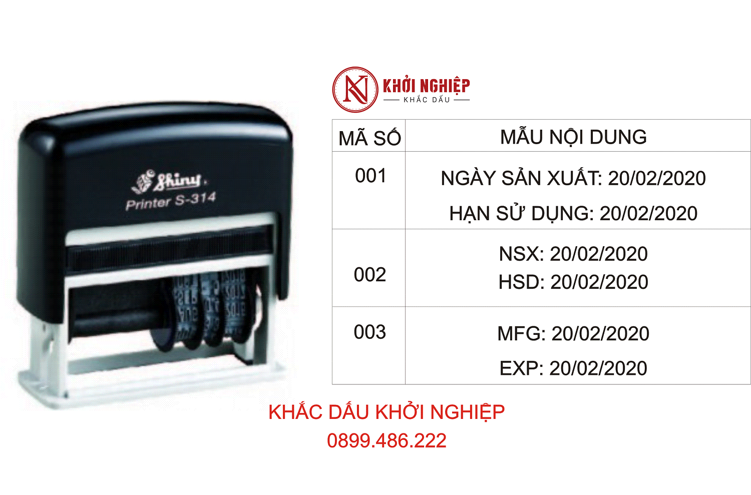 Đối với loại dấu này khách hàng chỉ có thể lựa chọn 1 dòng chữ trên con dấu. Ví dụ: "Ngày sản Xuất: ..../..../....." hoặc nội dung " hạn sử dụng .../..../...." nếu muốn có cả 2 con dấu này quý khách phải làm 2 con dấu riêng biệt và đóng từng lần