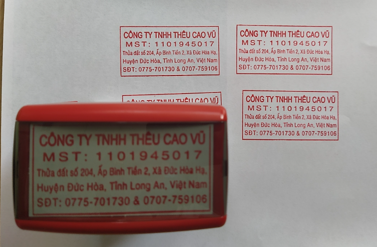 - Mộc dấu vuông mã số thuế công ty. Nội dung của con dấu này bao gồm: tên doanh nghiệp, mã số thuế, đại chỉ công ty. Kích thước là tùy vào nội dung để khắc, thông thường là 22x58mm. Màu sắc thường được khách hàng sử dụng là màu đỏ.